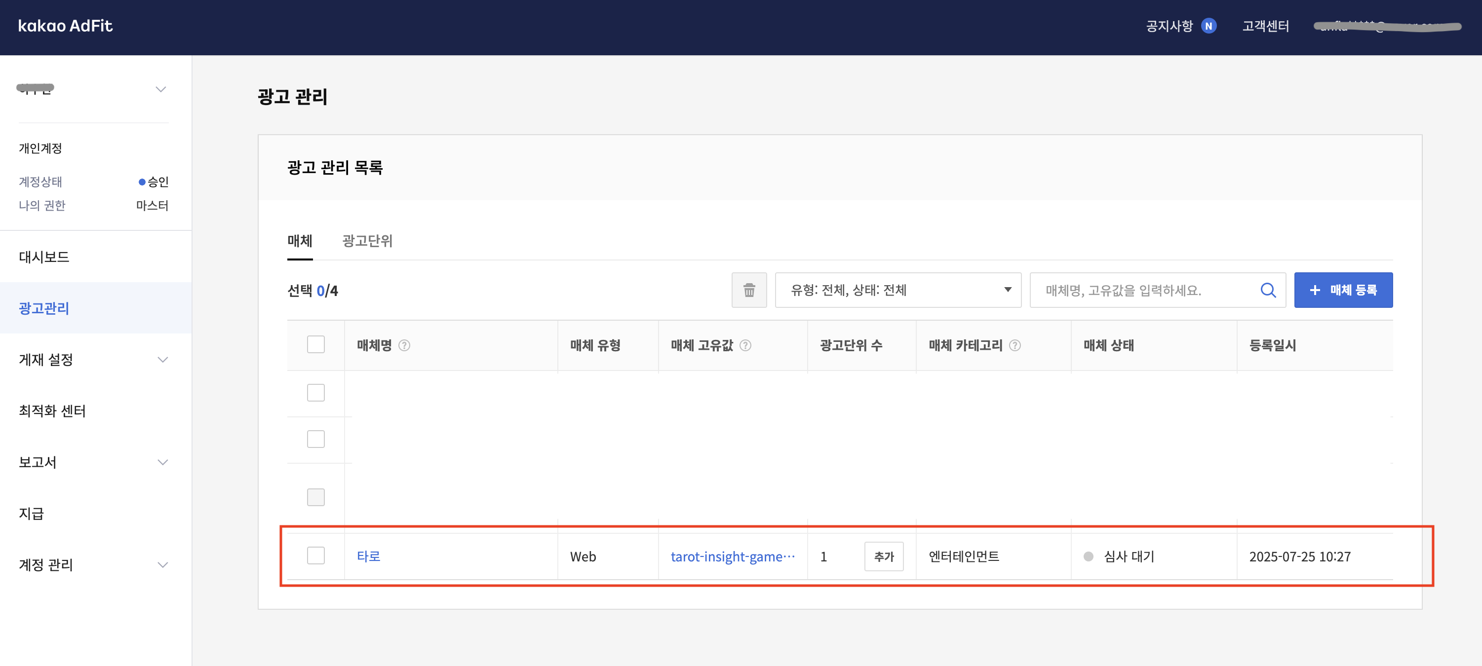 제일 먼저 해야 할 일은 카카오 애드핏에 로그인해서 광고를 달 매체를 등록하는 거예요. 카카오 애드핏 사이트에 접속하셔서 로그인 후, 좌측 메뉴에서 '광고 관리' 페이지로 이동해 주세요. 그리고 바로 보이는 '매체 등록' 버튼을 클릭하시면 됩니다.