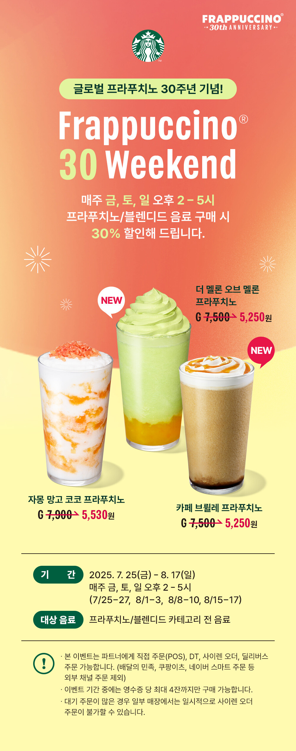 - 프라푸치노 30 위켄드: 7/25~8/17 매주 금토일 오후 2~5시, 프라푸치노/블렌디드 음료 30% 할인! (인당 최대 4잔)