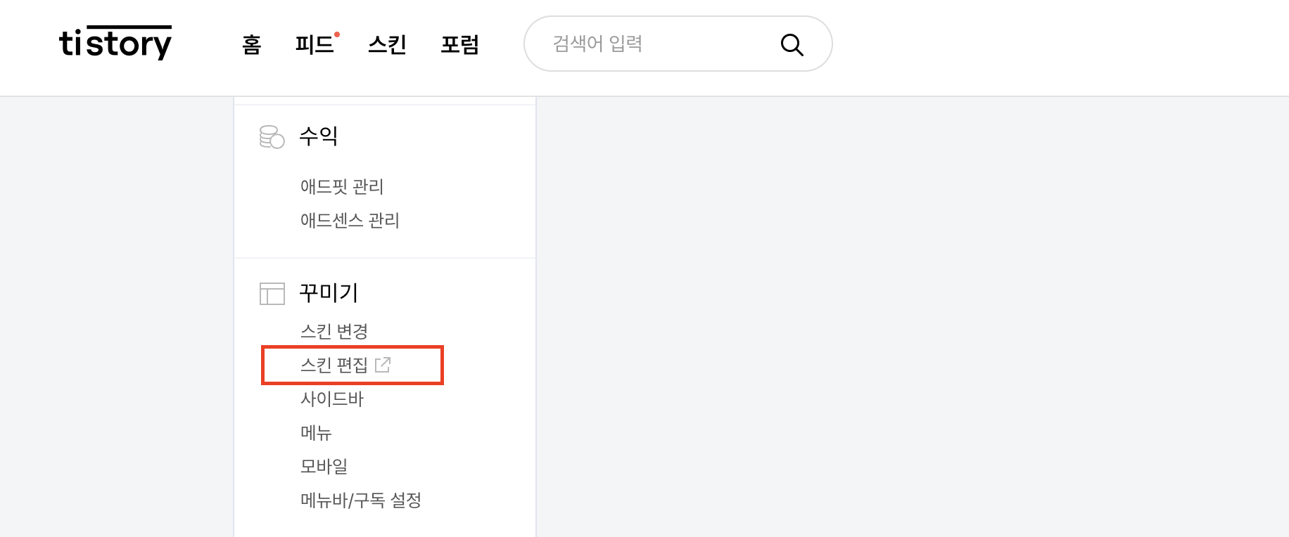 제일 먼저 티스토리 관리자 페이지로 접속해 주세요. 좌측 메뉴를 보시면 다양한 메뉴들이 쭉~ 보이실 텐데요. 그중에서 '꾸미기' 메뉴에서 하위 메뉴에 있는 '스킨편집'을 클릭해 주시면 됩니다.