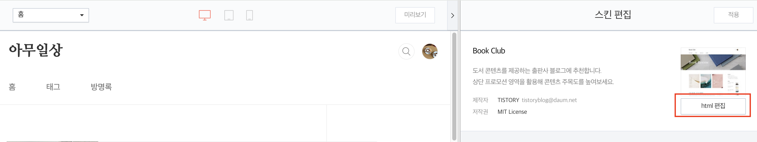 스킨편집 화면으로 들어오셨다면, 우측 상단에 'html 편집' 버튼이 보이실 거예요. 이 버튼을 누르면 드디어(?) 복잡한 코드의 세계로 진입하게 됩니다. 두근두근! 😆 아마 광고 삽입 해보신 분들은 익숙하실거에요ㅎ