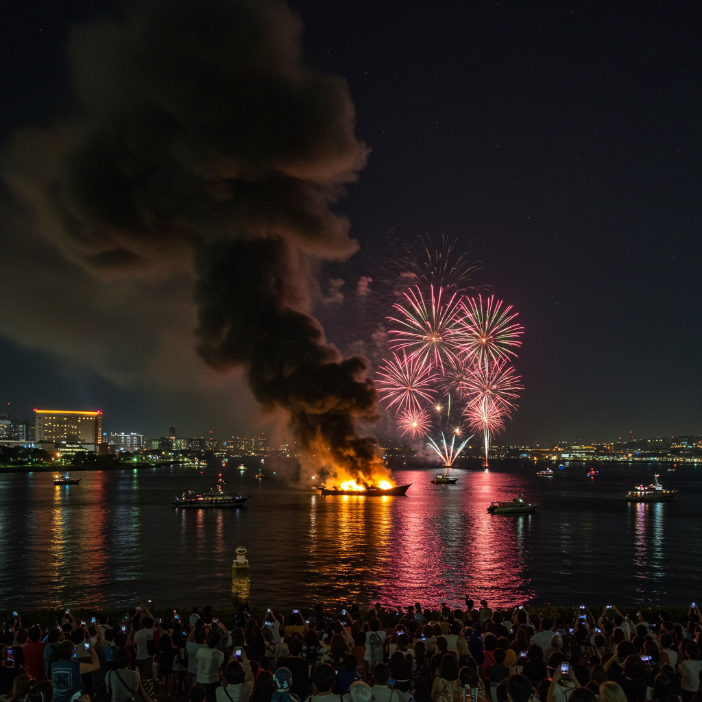 - 사고 개요: 요코하마 불꽃축제 중 폭죽 오발로 추정되는 사고가 발생해 선박 2척이 불에 탐.